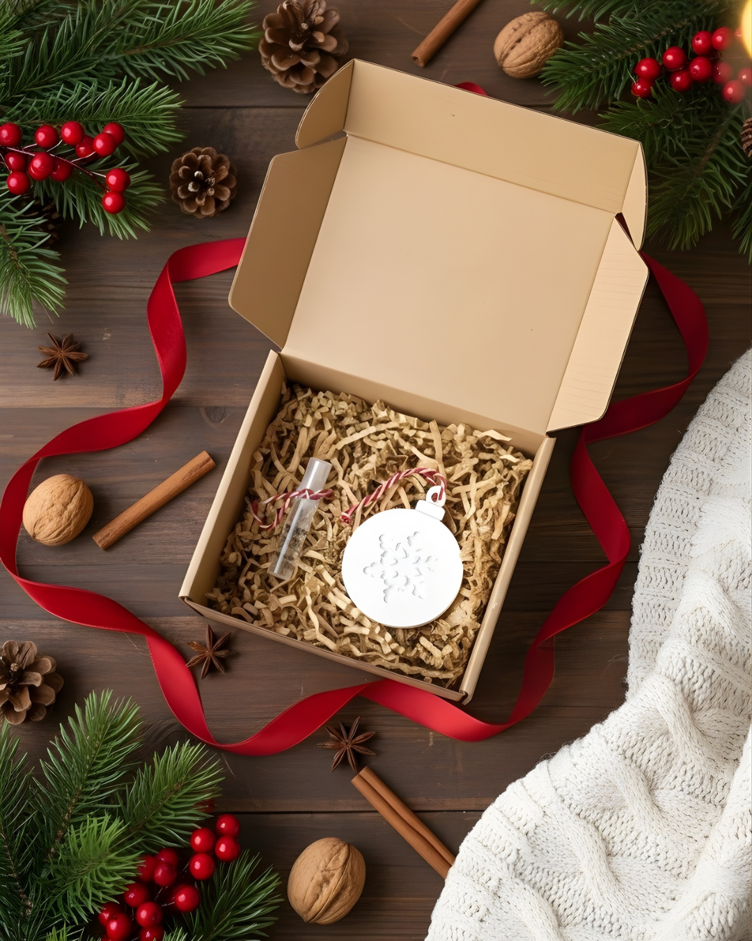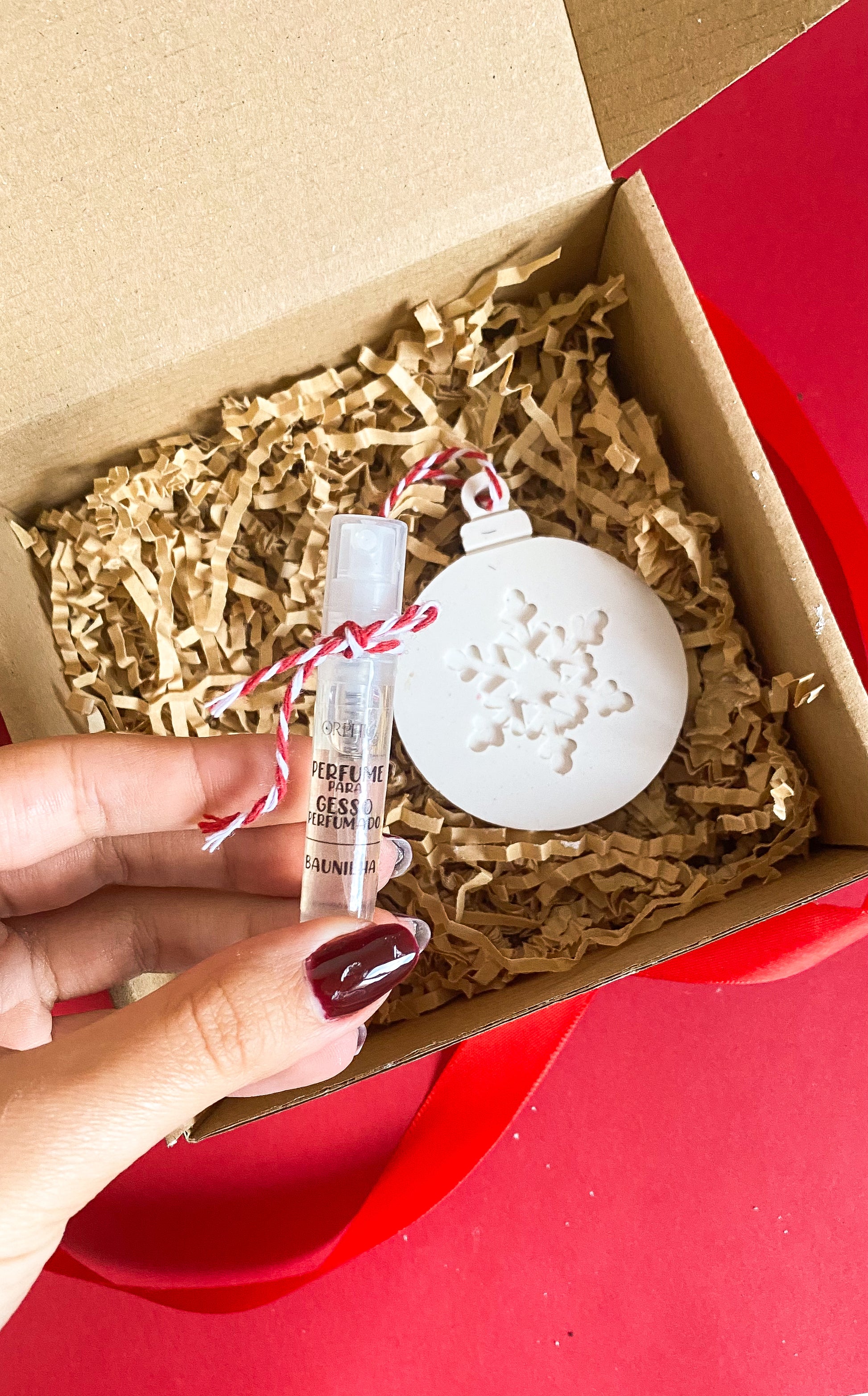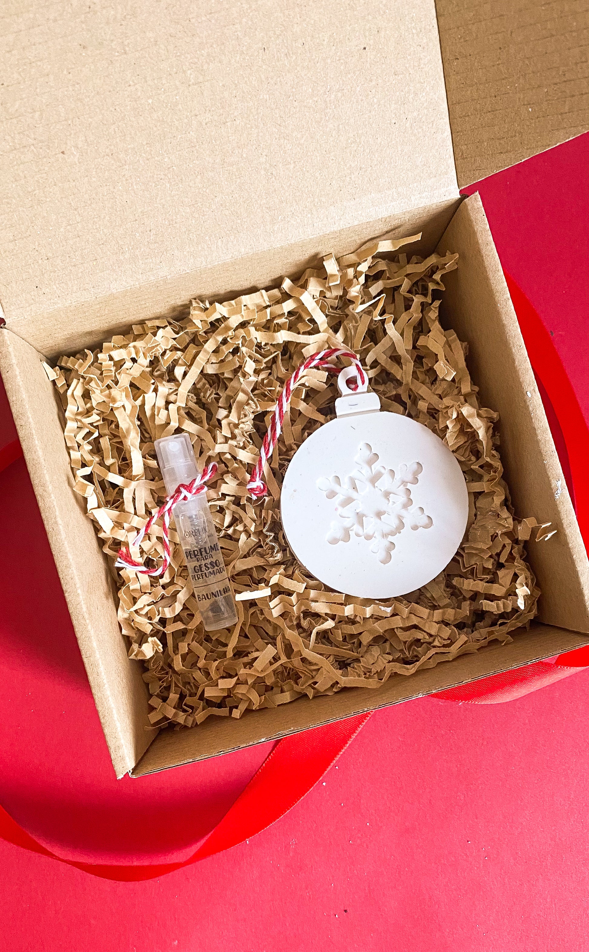 - Ornamento de Gesso Perfumado à Escolha: Uma peça de arte em gesso (apenas em branco), visualmente encantadora, que adiciona um toque perfumado duradouro.